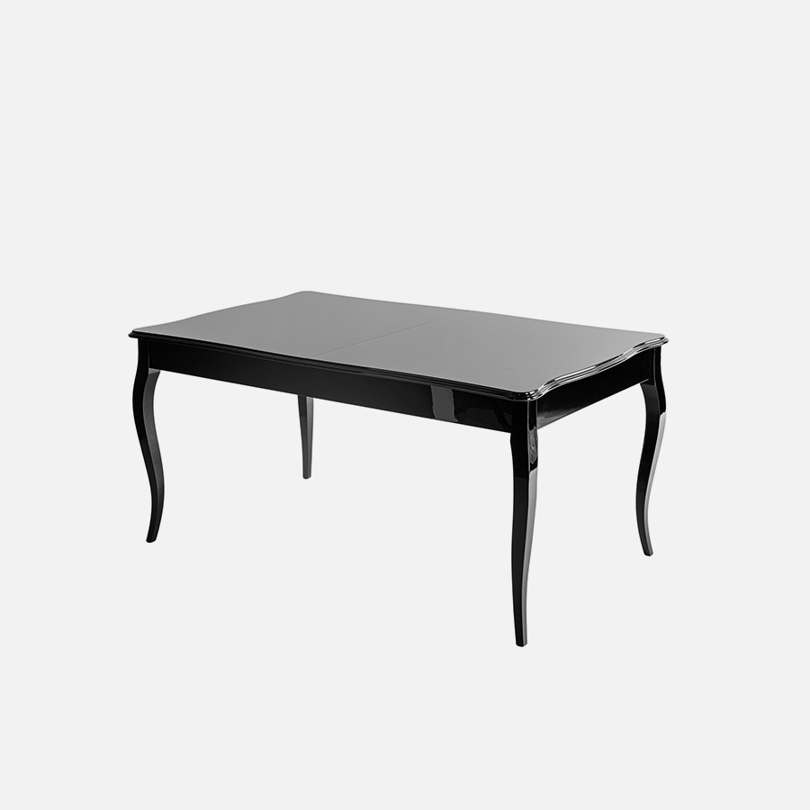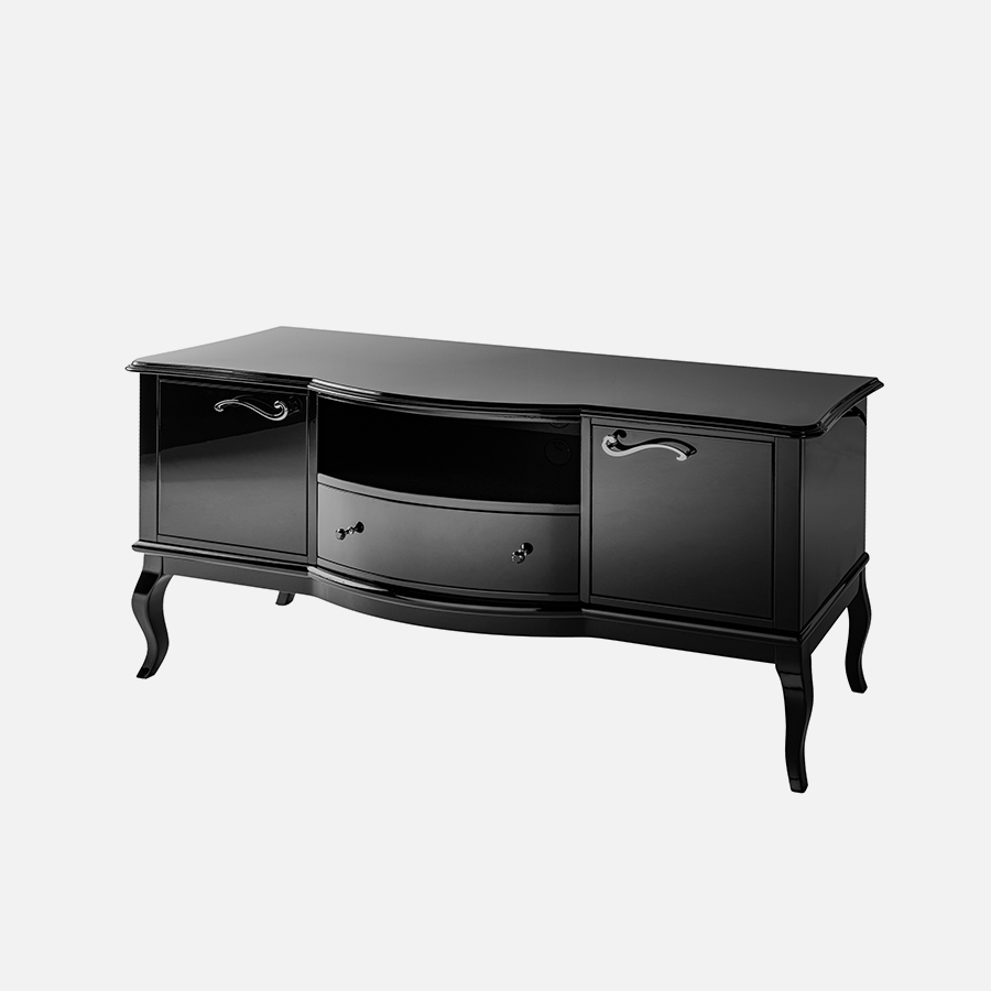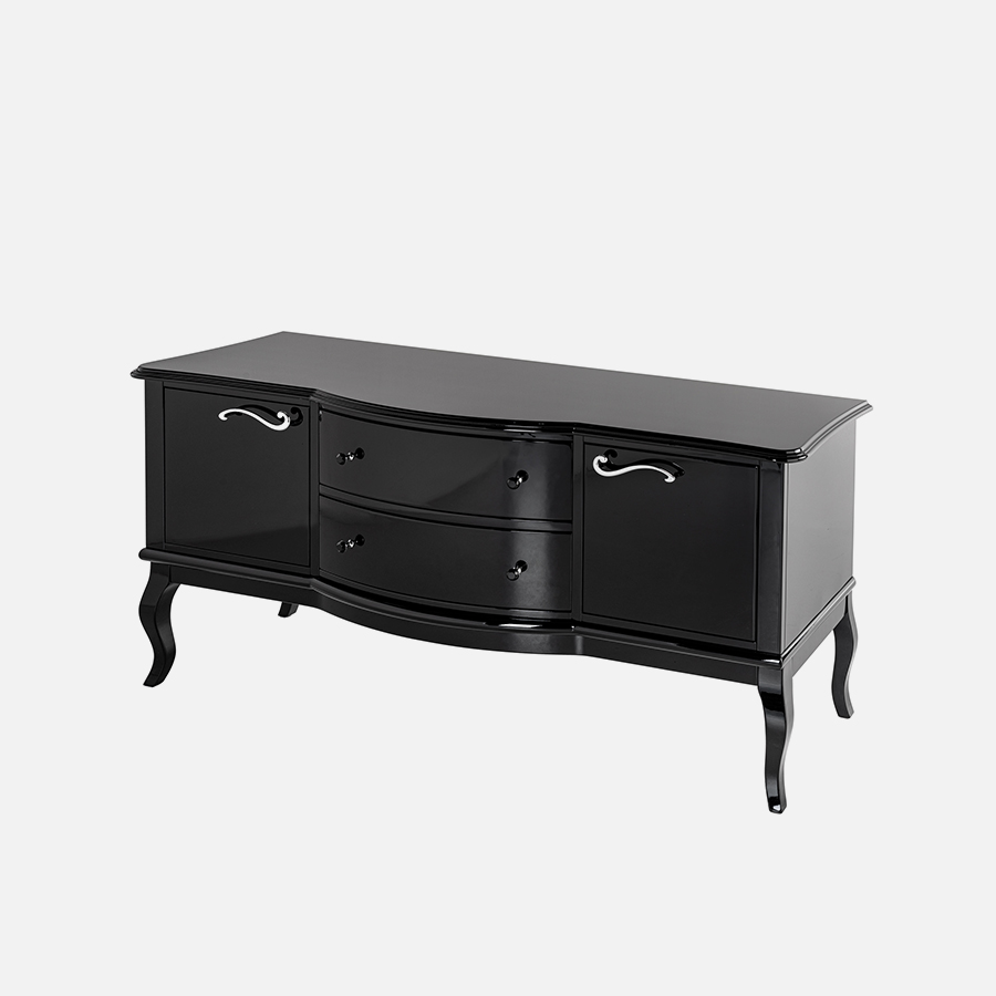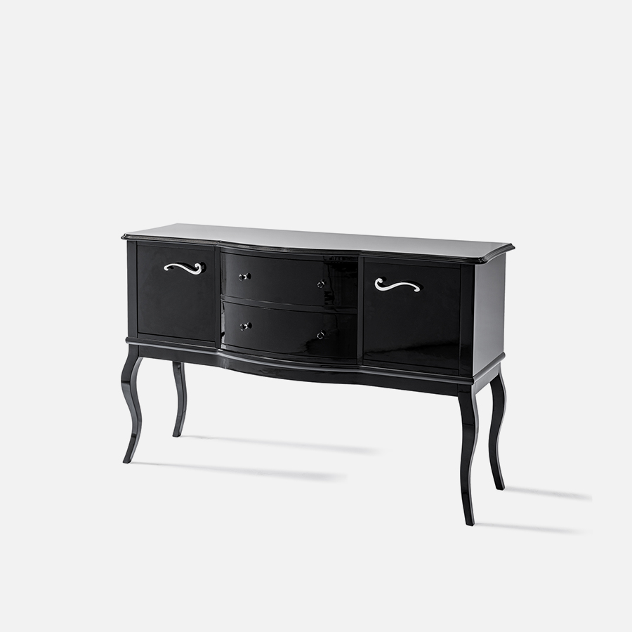 Komody, stoły oraz pomocniki wyrózniają się figlarnie giętymi nogami oraz eleganckimi uchwytami. Delikatne kształty tej ekskluzywnej, olchowej kolekcji podkreślone zostały klasycznymi kolorami - perłową bielą i fortepianową czernią w wysokim połysku.