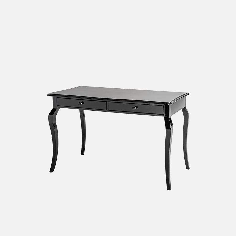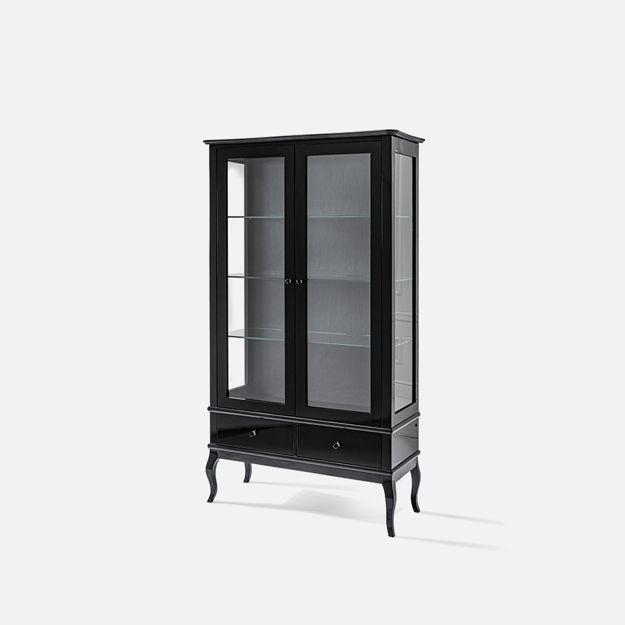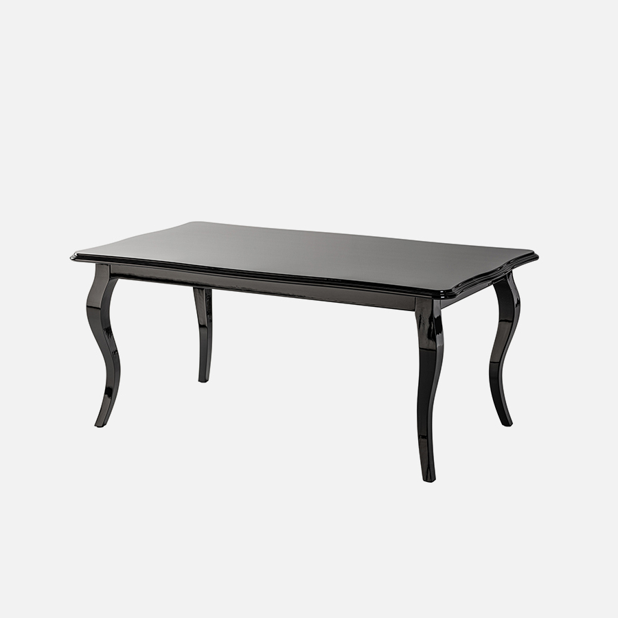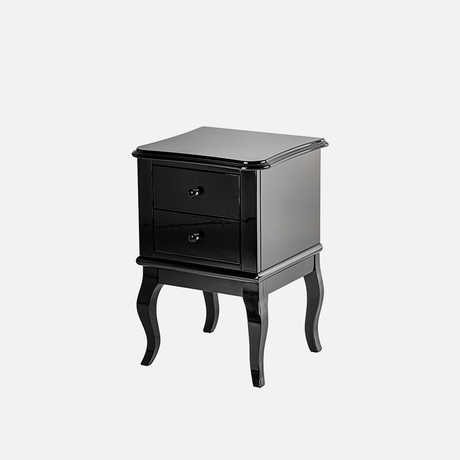 Komody, stoły oraz pomocniki wyrózniają się figlarnie giętymi nogami oraz eleganckimi uchwytami. Delikatne kształty tej ekskluzywnej, olchowej kolekcji podkreślone zostały klasycznymi kolorami - perłową bielą i fortepianową czernią w wysokim połysku.